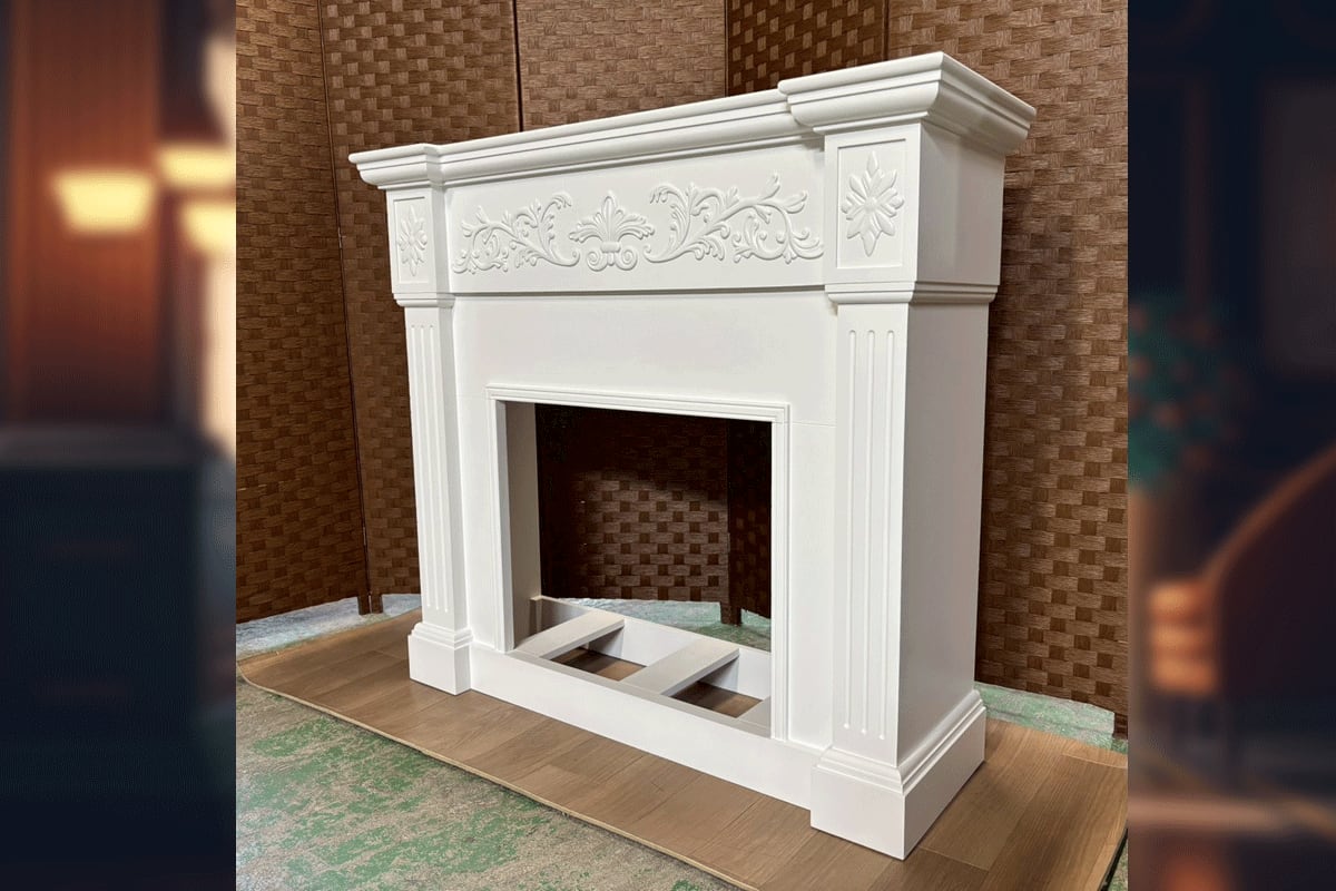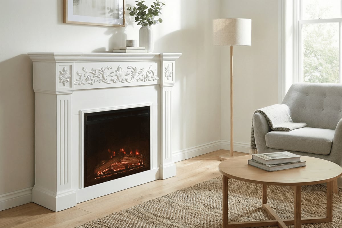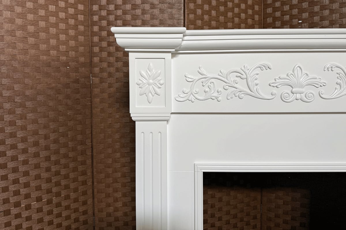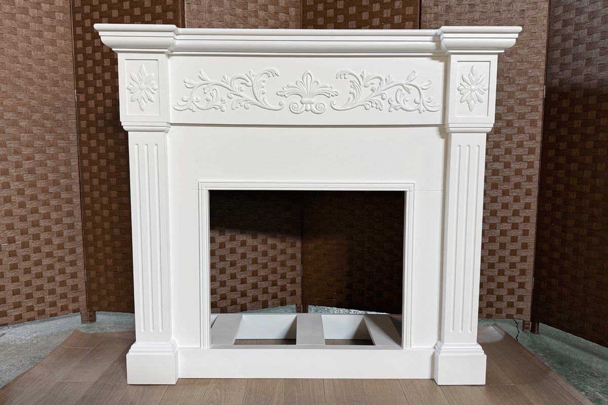 優雅な花柄彫刻が特徴のトラディショナルスタイルの電気暖炉です。