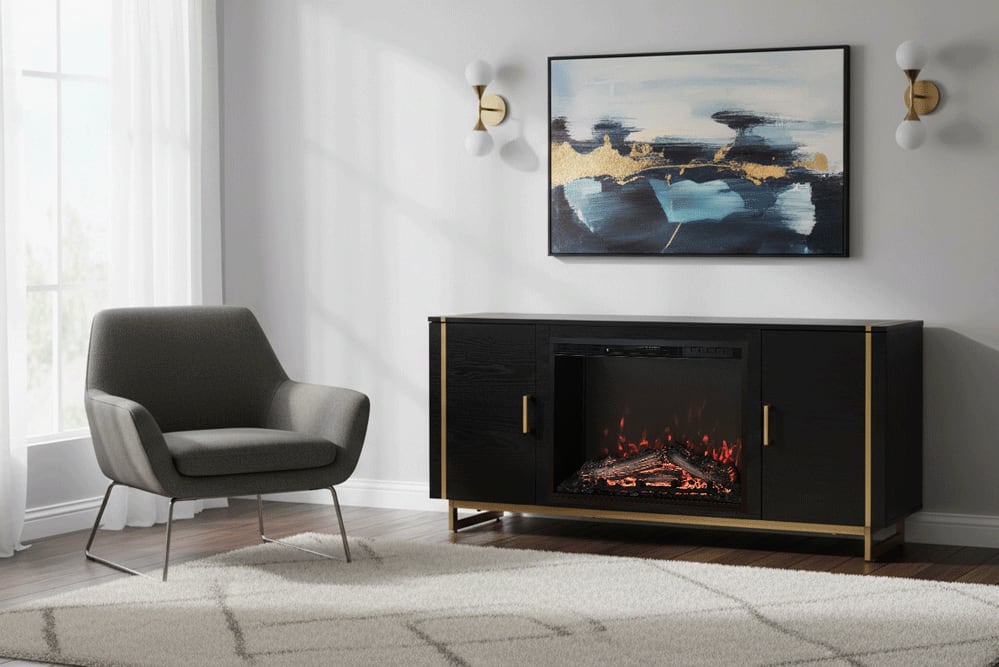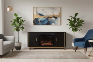 シックなスタイルのコンソール電気暖炉です。ゴールドのアクセントが洗練されたモダンな雰囲気を加えます。ソフトクローズドアになっています。